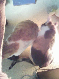 おかんの膝の上で丸まってるゆずに最初はちょっかいを出してるだけなんですが、だんだんとみかんもゆずもヒートアップ!