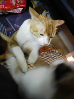 そしてみかんは足元のヒーターの前でぬくぬく…が日常なのですが、たまにおかんの膝の上争奪戦が始まります。