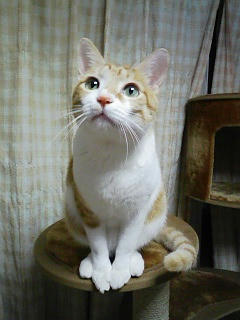 みかんが猫タワーの丸板にお座りをしていました。