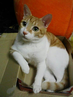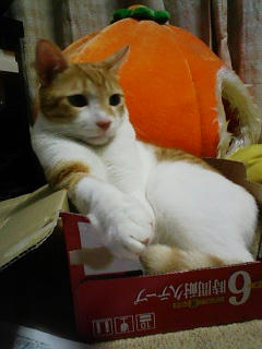 猫達のご飯の準備やらトイレの掃除やらをしていたらみかんが偉そうに箱の中で踏ん反り返ってました。