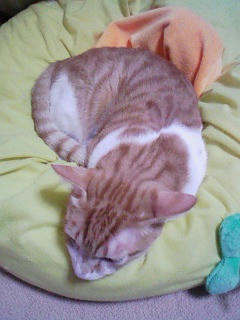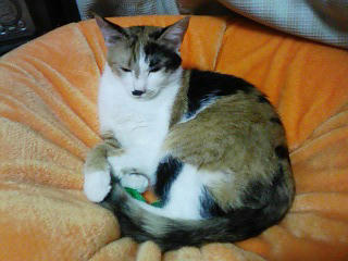 その頃みかんはへたれオレンジクッションに丸まって寝ていました。