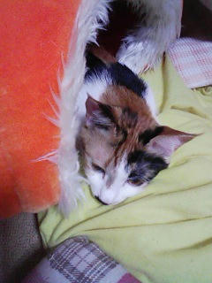 昨日もちょっと触れたのですが、みかんはおかんの膝の上にうまい事納まりきれないのでおかんの腕を補助枕にして満足そうに寝ています。