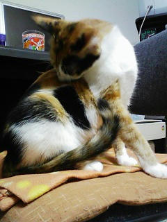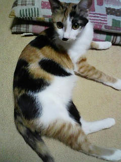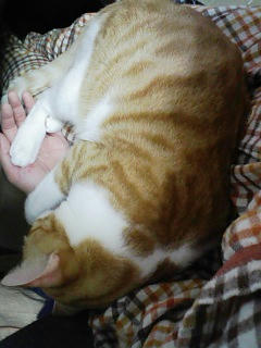 本当は膝の上に飛び乗ってきた所を捕まえて強引に丸めたら暖かくて気持ちよくなったのかそのまま居座っただけなんですが(笑)