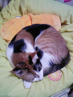 みかんはいつもの布団の上…ではなく、趣旨変えなのか洗濯済みの畳んだ敷きパッドの上で丸まっていました。