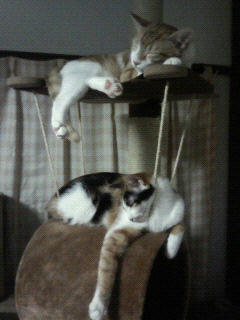 ふと見上げたら猫タワーで二人とも気持ち良さそうに寝ていました。