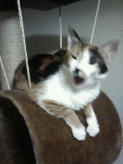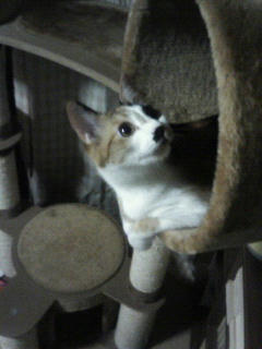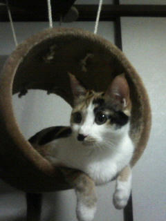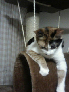 おかんは後ろを向いて机に向かっていたので確実ではなかったのですが、毎度のようにゆずが猫タワーをギシギシ言わせながらブランコ部分に乗っていたようです。