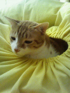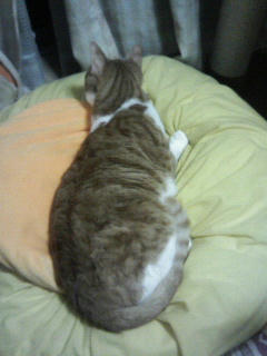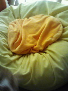 これ、何で乗ってくれたのかしら?と思ったらオレンジクッションの下に座布団が置いてあって柔らか過ぎずに安定して丸まれたからのようです。