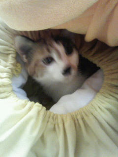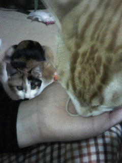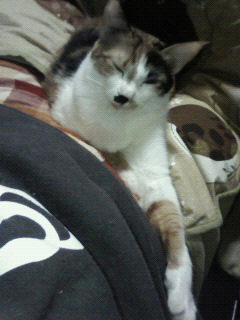 今朝は腕枕(というか腕の上に体乗せて)でおかんの顔のすぐ横で丸まってご満悦でした。(枕の上)