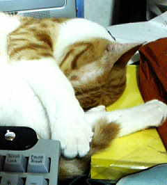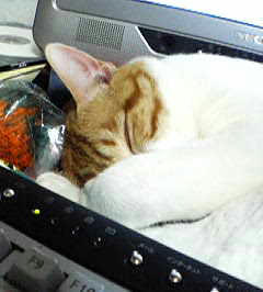 これ、パソコンのディスプレイとキーボードの間に無理矢理入り込んでむりやり丸まろうとして寝てるんです。