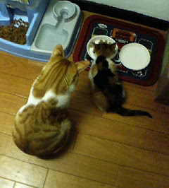 ご飯を食べるゆずの背中をじっとみつめるみかん。