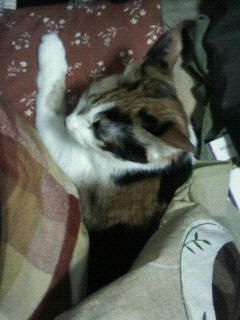 そしてこの場所とポーズに飽きてくるとおかんの膝の上、もしく腹の上にのぼってきて丸まります。