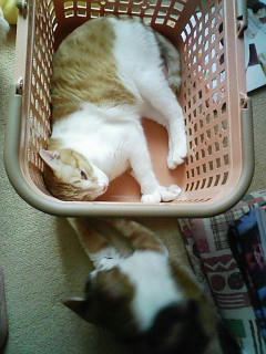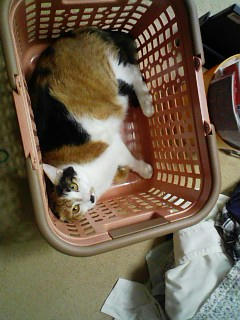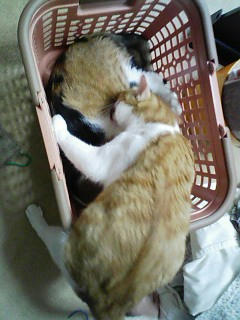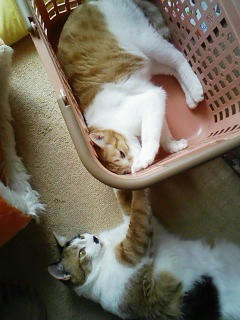 洗濯物を干していると猫達が虎視眈々と籠を狙いにやってきます。