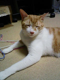 相変わらず待機体勢は布団の上に転がっているのですが、爪はバリバリ研ぐしゆずにちょっかいも出してます。